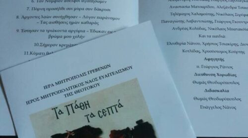 Με τίτλο “Τα πάθη τα Σεπτά” η Σχολή Βυζαντινής Μουσικής της Ιεράς Μητροπόλεως Σισανίου και Σιατίστης και το παράρτημα της σχολής στα Γρεβενά απέδωσαν με την απλότητα, την ομορφιά, την μελωδικότητα και κυρίως με κατάνυξη ύμνους που ακούγονται την Μεγάλη Εβδομάδα.