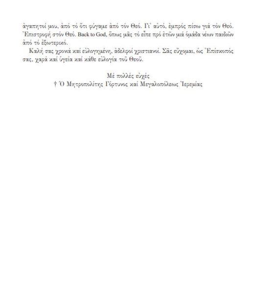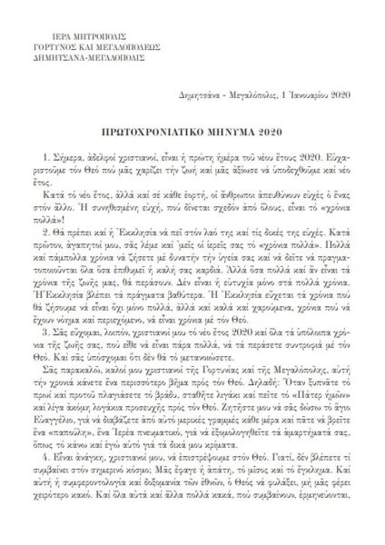 Πρωτοχρονιάτικο Μήνυμα 2020 εκ μέρους του Σεβασμιωτάτου Μητροπολίτου Γόρτυνος και Μεγαλοπόλεως, κ. Ιερεμίου, όπου, καθώς αναφέρει χαρακτηριστικά: