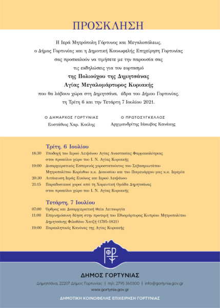 Για τη μεγάλη πανήγυρη της Δημητσάνας και τον εορτασμό της Πολιούχου, Αγίας Μεγαλομάρτυρος Κυριακής, προετοιμάζονται η Ιερά Μητρόπολη Γόρτυνος και Μεγαλοπόλεως, ο Δήμος Γορτυνίας και η Δημοτική και Κοινωφελής Επιχείρηση της Γορτυνίας.