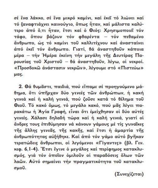 “Θα θυμάστε, παιδιά, που είπαμε σε προηγούμενο μάθημα, ότι υπήρχαν δύο γενεές των ανθρώπων, η κακή γενεά και η καλή γενεά, που ζούσε κατά το θέλημα του Θεού. Το κακό όμως, το μεγάλο κακό, που μας λέγει παρακάτω η Αγία Γραφή, είναι ότι εμείχθησαν οι δύο αυτές γενεές. Χάλασε δηλαδή τώρα και η καλή γενεά, γιατί οι άνδρες τους επιθύμησαν να κάνουν γάμους με τις γυναίκες της άλλης γενεάς, της κακής, και έτσι η αμαρτία της ανθρωπότητας αυξήθηκε. Και από τον γάμο αυτό βγήκαν τερατώδεις άνθρωποι, οι λεγόμενοι «Γίγαντες» (βλ. Γεν. κεφ. 6,1-4). Έτσι έγινε ο μεγάλος και περίφημος κατακλυσμός, για τον οποίον ομιλούν οι παραδόσεις όλων των λαών. Αυτό σημαίνει την πραγματικότητα του κατακλυσμού” αναφέρει, μεταξύ άλλων, ο Σεβασμιώτατος.