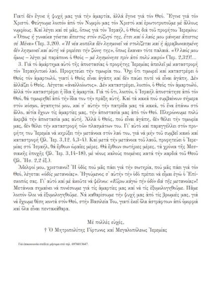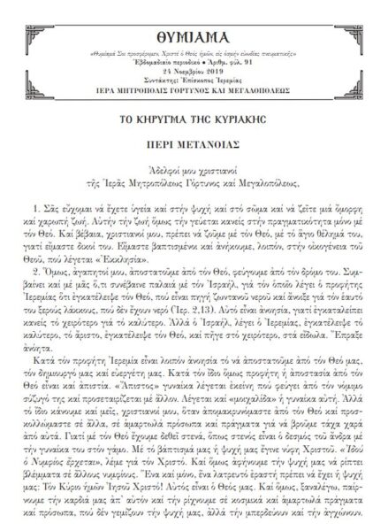 Επίκαιρο “ΘΥΜΙΑΜΑ” εκ μέρους του Σεβ. Μητροπολίτου Γόρτυνος και Μεγαλοπόλεως, κ. Ιερεμίου, υπό το θέμα “ΠΕΡΙ ΜΕΤΑΝΟΙΑΣ”, όπου, όπως αναφέρεται χαρακτηριστικά: