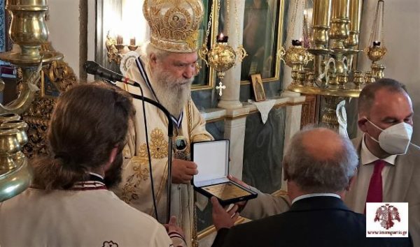 Ακολούθως, η Αδελφότητα Δημητσανιτών ‘’Γρηγόριος ο Ε΄’’, δια του Προέδρου της κ. Αθανασίου Μαγουλιανίτη, τίμησε τον σεπτό Ποιμενάρχη με το ‘’μετάλλιο του Αγίου Γρηγορίου Ε΄’’ και με μία αναμνηστική τιμητική πλακέτα, για το επί 42 έτη πλούσιο πνευματικό, κοινωνικό και φιλανθρωπικό του έργο στην Ιερά Μητρόπολη Μονεμβασίας και Σπάρτης, για την πολύτιμη προσφορά του στην Ιερά Μητρόπολη Γόρτυνος και Μεγαλοπόλεως, την οποία διακόνησε ως ιεροκήρυκας για ένδεκα συναπτά έτη και δύο φορές ως Τοποτηρητής, αλλά και γενικότερα για την σημαντική προσφορά του στην Εκκλησία της Ελλάδος. Επιπροσθέτως, ευχήθηκε στον Σεβασμιώτατο υγεία και δύναμη, για να συνεχίσει απρόσκοπτα το θεάρεστο έργο του.