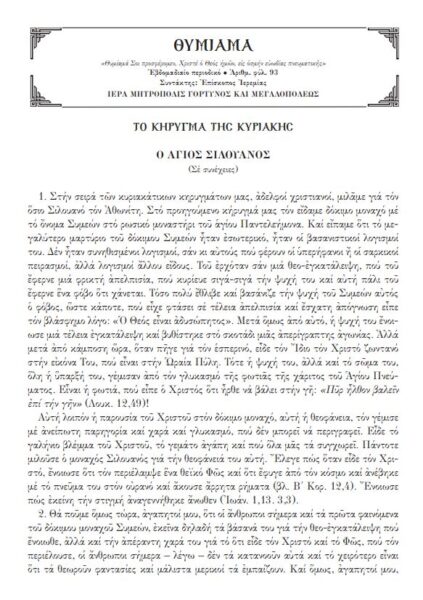 Επίκαιρο “ΘΥΜΙΑΜΑ”, Αριθμ. 93, εκ μέρους του Σεβασμιωτάτου Μητροπολίτου Γόρτυνος και Μεγαλοπόλεως, κ. Ιερεμίου, με θέμα τον Βίο του Αγίου Σιλουανού του Αθωνίτου (σε συνέχειες).