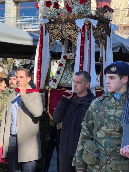 Στη συνέχεια, με τη συμμετοχή κλήρου και λαού, πραγματοποιήθηκε πάνδημη λιτανεία της ιεράς εικόνας του Αγίου Τρύφωνα.