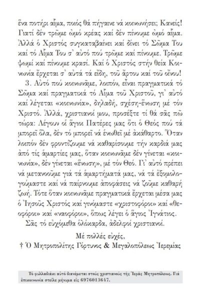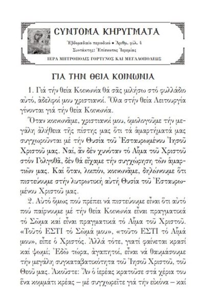ΣΥΝΤΟΜΑ ΚΗΡΥΓΜΑΤΑ, Αριθμ. 4 (ΓΙΑ ΤΗΝ ΘΕΙΑ ΚΟΙΝΩΝΙΑ) εκ μέρους του Σεβασμιωτάτου Μητροπολίτου Γόρτυνος και Μεγαλοπόλεως κ. Ιερεμίου, όπου, καθώς αναφέρει, μεταξύ άλλων: “Όλα στη Θεία Λειτουργία γίνονται για τη Θεία Κοινωνία”.