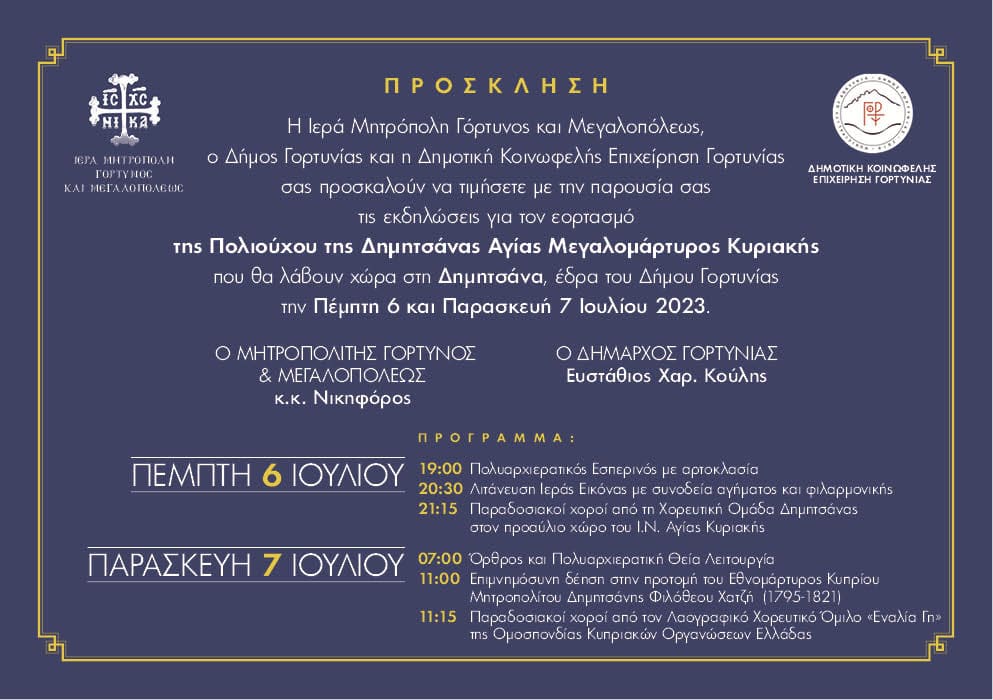 Ι.Μ. Γόρτυνος και Μεγαλοπόλεως 06 Ιουλίου, 2023 Πρόγραμμα εορτασμού της Πολιούχου της Δημητσάνας Αγίας Κυριακής Διαδώστε: Το πρόγραμμα των εορτασμών για την Πολιούχο της Δημητσάνας Αγία Μεγαλομάρτυρα Κυριακή γνωστοποιεί η Ιερά Μητρόπολη Γόρτυνος και Μεγαλοπόλεως, ο Δήμος Γορτυνίας και η Δημοτική Κοινωφελής Επιχείρηση Γορτυνίας. Αναλυτικά το πρόγραμμα: Διαδώστε: