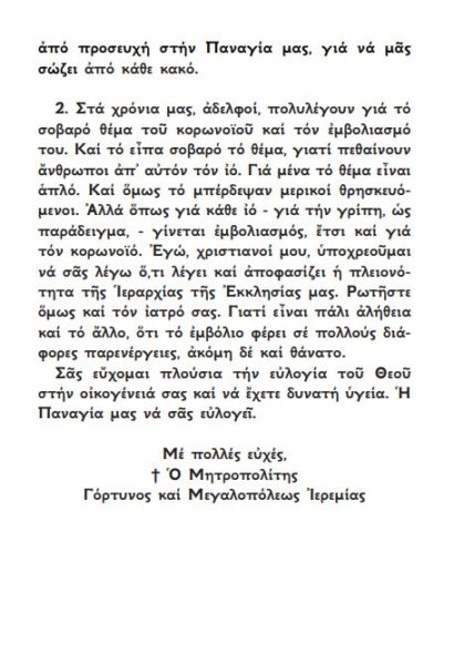 2. Στά χρόνια μας, ἀδελφοί, πολυλέγουν γιά τό σοβαρό θέμα τοῦ κορωνοϊοῦ καί τόν ἐμβολιασμό του. Καί τό εἶπα σοβαρό τό θέμα, γιατί πεθαίνουν ἄνθρωποι ἀπ᾽ αὐτόν τόν ἰό. Γιά μένα τό θέμα εἶναι ἁπλό. Καί ὅμως τό μπέρδεψαν μερικοί θρησκευόμενοι. Ἀλλά ὅπως γιά κάθε ἰό – γιά τήν γρίπη, ὡς παράδειγμα, – γίνεται ἐμβολιασμός, ἔτσι καί γιά τόν κορωνοϊό. Ἐγώ, χριστιανοί μου, ὑποχρεοῦμαι νά σᾶς λέγω ὅ,τι λέγει καί ἀποφασίζει ἡ πλειονότητα τῆς Ἱεραρχίας τῆς Ἐκκλησίας μας. Ρωτῆστε ὅμως καί τόν ἰατρό σας. Γιατί εἶναι πάλι ἀλήθεια καί τό ἄλλο, ὅτι τό ἐμβόλιο φέρει σέ πολλούς διάφορες παρενέργειες, ἀκόμη δέ καί θάνατο.