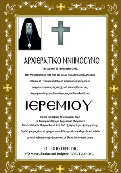 Την Κυριακή 23 Ιανουαρίου στον Μητροπολιτικό Ιερό Ναό Αγίου Νικολάου Μεγαλόπολης θα τελεστεί το τεσσαρακονθήμερο μνημόσυνο υπέρ ανάπαυσης της ψυχής του μακαριστού Μητροπολίτη Γόρτυνος και Μεγαλουπόλεως κυρού Ιερεμίου.