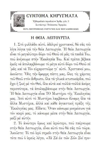 ΣΥΝΤΟΜΑ ΚΗΡΥΓΜΑΤΑ, Αριθμ. 3, υπό το θέμα “ΘΕΙΑ ΛΕΙΤΟΥΡΓΙΑ” εκ μέρους του Σεβασμιωτάτου Μητροπολίτου Γόρτυνος και Μεγαλοπόλεως κ. Ιερεμίου, όπου, μεταξύ άλλων, αναφέρει: “Τὰ σὰ ἐκ τῶν σῶν Σοὶ προσφέρομεν… Η ώρα αυτή είναι μία θεοφάνεια!”.