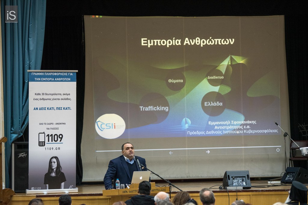 Η προσέλευση του κοινού ήταν μεγάλη, ειδικά στην εναρκτήρια ομιλία στο Πνευματικό Κέντρο της Μητροπόλεως,  όπου ο Στρατηγός ε.α. κ. Εμμανουήλ Σφακιανάκης, Ειδικός ερευνητής και αναλυτής ηλεκτρονικών εγκλημάτων – Πρόεδρος του Cyber Security International Institute (CSII), μίλησε για το μέγεθος του εγκλήματος της εμπορίας ανθρώπων σε παγκόσμια κλίμακα, τονίζοντας τους κινδύνους που κρύβονται στο “σκοτεινό διαδίκτυο” και που καθιστούν το trafficking μια σύγχρονη πραγματικότητα. Ο κ. Σφακιανάκης προειδοποίησε ιδιαίτερα για την εξαπάτηση των ανυποψίαστων ανήλικων ατόμων μέσω του διαδικτύου.