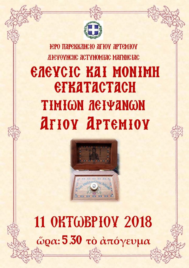 Ιδιαίτερη τιμή και ευλογία για τους άνδρες και τις γυναίκες της ΕΛ.ΑΣ, της Μαγνησίας συνιστά η έλευση και μόνιμη εγκατάσταση στο ιερό Παρεκκλήσιο του Αγίου Αρτεμίου της Αστυνομικής Δ/νσης Μαγνησίας, τεμαχίου του ιερού Λειψάνου του Προστάτου Αγίου της ΕΛ.ΑΣ.