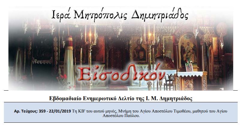 Κυκλοφορήθηκε το Εβδομαδιαίο Ενημερωτικό Δελτίο της Ι. Μ. Δημητριάδος «Εισοδικόν» τευχ. 359