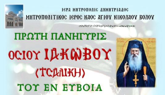 Μικρή πανήγυρη θα πραγματοποιηθεί στον Μητροπολιτικό Ιερό Ναό Αγίου Νικολάου Βόλου, το διήμερο 21-22 Νοεμβρίου 2018 εξ αφορμής του πρώτου εορτασμού της μνήμης του νεοφανούς Οσίου Ιακώβου του Τσαλίκη, του εν Ευβοία.