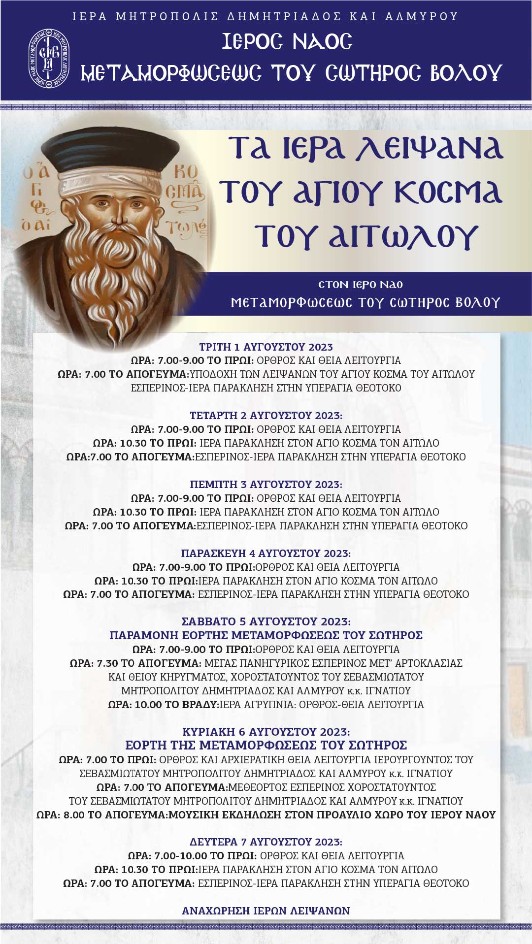 Τα Ιερά Λείψανα του Αγίου Κοσμά θα αφιχθούν στον Ιερό Ναό Μεταμορφώσεως του Σωτήρος Βόλου την Τρίτη 1η Αυγούστου 2023, στις 7 μ.μ., όπου επισήμως θα τα υποδεχθεί ο ιερός κλήρος και ο ευσεβής λαός.