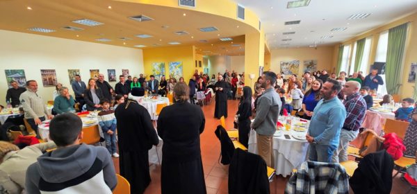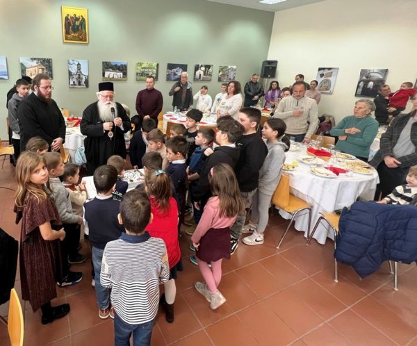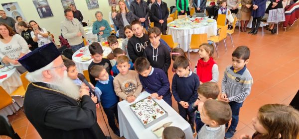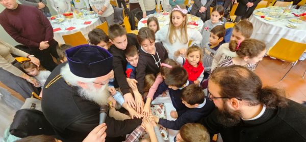 Μετά το πέρας της όμορφης αυτής συνάντησης, παρατέθηκε γεύμα για όλες τις οικογένειες, σε μικρούς και μεγάλους, στη μεγάλη αίθουσα «Ιωλκός», στο οποίο ο Σεβασμιώτατος ευλόγησε την πρωτοχρονιάτικη βασιλόπιτα.