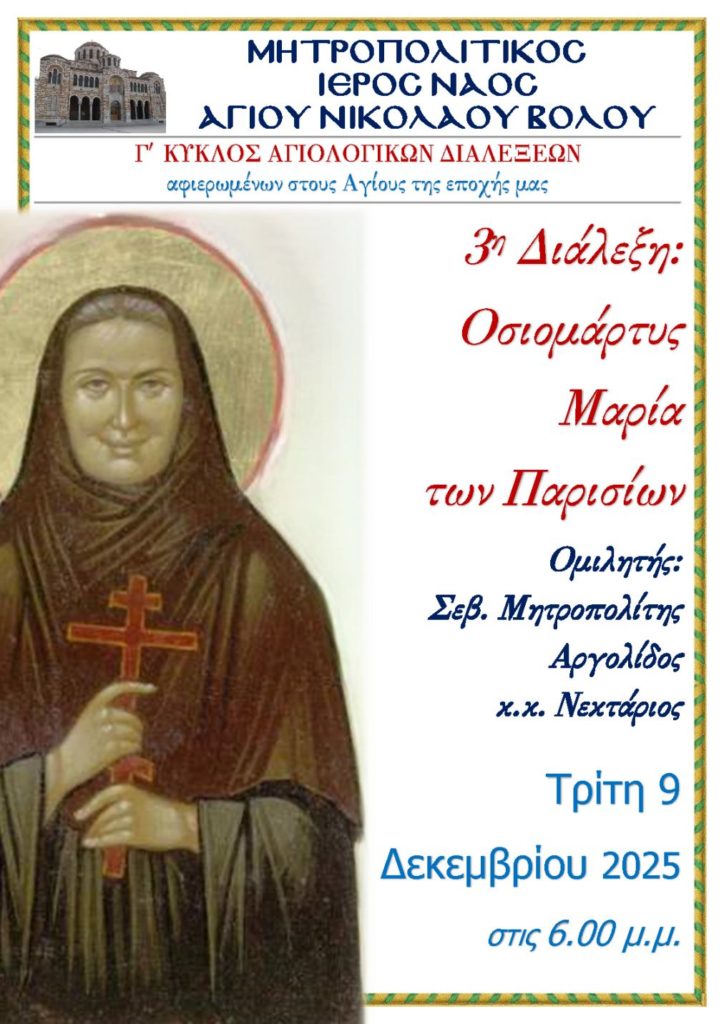 Η 3η Αγιολογική Διάλεξη θα πραγματοποιηθεί την Τρίτη 9 Δεκεμβρίου, στις 6.00 μ.μ., στον Μητροπολιτικό Ιερό Ναό Αγίου Νικολάου Βόλου και θα είναι αφιερωμένη στην Νεοφανή Οσιομάρτυρα Μαρία των Παρισίων, η οποία δολοφονήθηκε σε θάλαμο αερίων Ναζιστικού στρατοπέδου συγκέντρωσης το 1945. Για την Οσιομάρτυρα Μαρία των Παρισίων θα ομιλήσει ο Σεβ. Μητροπολίτης Αργολίδος κ. Νεκτάριος.