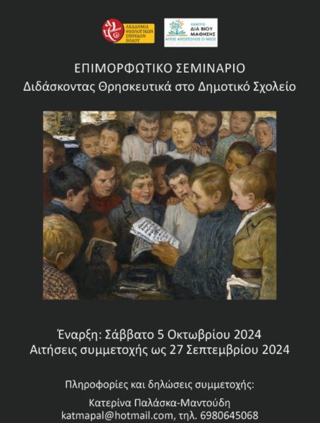 Το Κέντρο Δια Βίου Μάθησης (ΚΕΔΙΒΙΜ) «Άγιος Απόστολος ο Νέος» της Ιεράς Μητροπόλεως Δημητριάδος και Αλμυρού ξεκινά ένα νέο μοριοδοτούμενο επιμορφωτικό πρόγραμμα με τίτλο «Διδάσκοντας Θρησκευτικά στο Δημοτικό Σχολείο», που απευθύνεται σε εκπαιδευτικούς της Πρωτοβάθμιας Εκπαίδευσης.