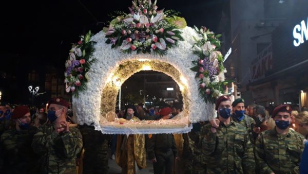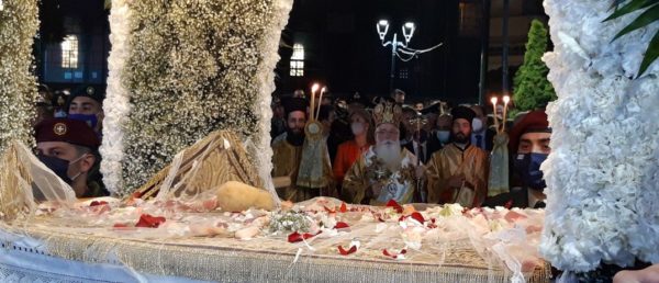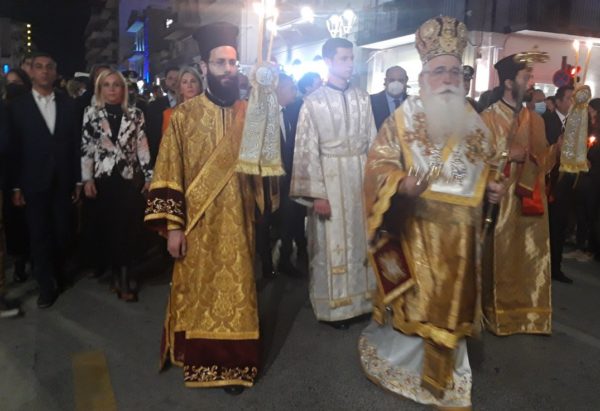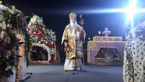 Μετά την προβλεπόμενη δέηση, ο Σεβ. Ποιμενάρχης κ. Ιγνάτιος απευθύνθηκε στο μέγα πλήθος, χαρακτηρίζοντας την σιωπηλή παρουσία του «εκκωφαντική, που αποδεικνύει τί σημαίνει στον τόπο μας η Ορθόδοξη πίστη, η Παράδοση και η ενότητά μας. Καταθέτουμε, απόψε, ενώπιον του Κυρίου κάθε μας πόνο, που βιώσαμε κατά την παιδαγωγία της πανδημίας. Στερηθήκαμε στιγμές σαν κι αυτή, όμως κάναμε υπομονή, κρατήσαμε την ενότητά μας και βγαίνουμε από την περιπέτεια πιο σοφοί. Σήμερα μένει πίσω κάθε απελπιστική σκέψη, γιατί ο Χριστός, που έγινε άνθρωπος, έφθασε μέχρι το τέλος της ανθρώπινης αδυναμίας, τον φυσικό θάνατο και μάλιστα, σταυρικό, για να δείξει ότι δεν είναι ο θάνατος το τέλος. Πλέον, είμαστε βέβαιοι ότι δεν σταματούν τα πράγματα στην επίγεια ζωή, αλλά μας περιμένει η αιωνιότητα, αρκεί να πάρουμε το δώρο του Χριστού, την αγάπη. Από αγάπη έγινε άνθρωπος, θυσιάστηκε και ανέβηκε στον Σταυρό, μας άφησε το Μυστήριο της Ευχαριστίας, την Εκκλησία και μέσα Της μας καλεί να βιώσουμε την εμπειρία της αγάπης μαζί Του και μεταξύ μας. Ακόμα και ο θάνατος του Χριστού είναι πρόσκαιρος. Τούτη την σιωπηλή νύκτα θα διαδεχθεί η νύκτα με τις χαρμόσυνες κωδωνοκρουσίες, γιατί η ζωή νίκησε τον θάνατο».