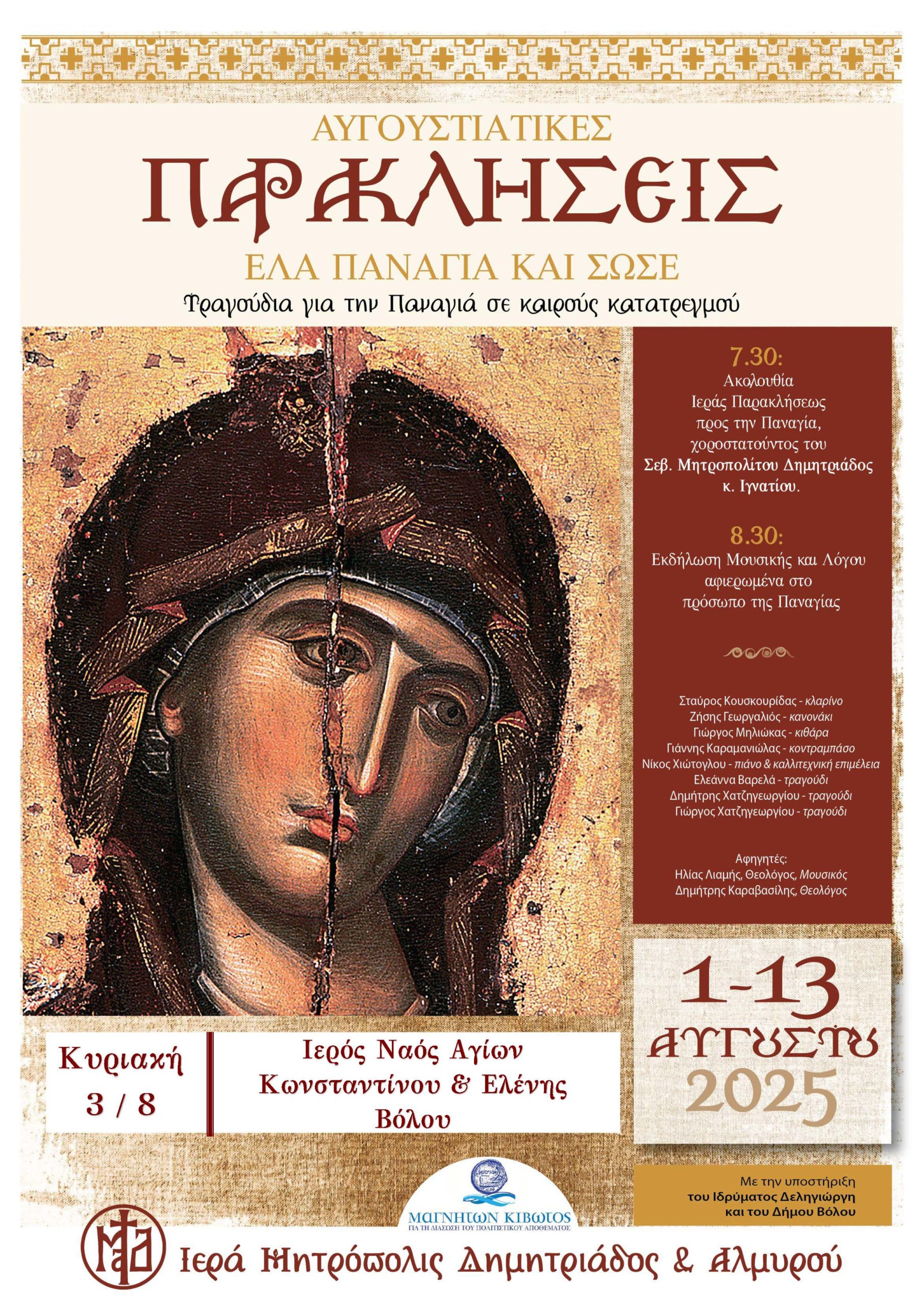 Η επόμενη εκδήλωση των «Αυγουστιάτικων Παρακλήσεων» είναι προγραμματισμένη για αύριο Κυριακή 3 Αυγούστου στον Ιερό Ναό Αγίων Κωνσταντίνου και Ελένης στην παραλία του Βόλου.