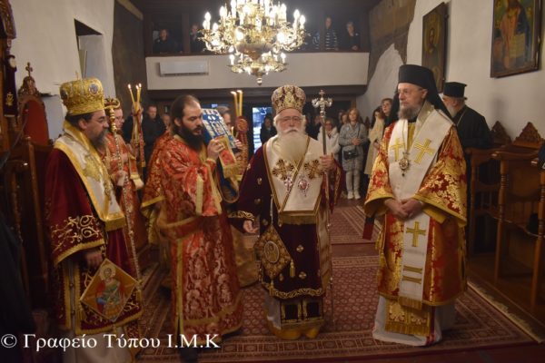 Την παραμονή της εορτής, αφού πραγματοποιήθηκε η υποδοχή του Ιερού Λειψάνου του Αγίου Μηνά, έμπροσθεν του Ιερού Παρεκκλησίου, εν συνέχεια τελέσθηκε ο Πολυαρχιερατικός Εσπερινός, χοροστατούντος και ομιλούντος του Θεοφ. Επισκόπου Τανάγρας κ. Αποστόλου και συγχοροστατούντων των δυο Μητροπολιτών.