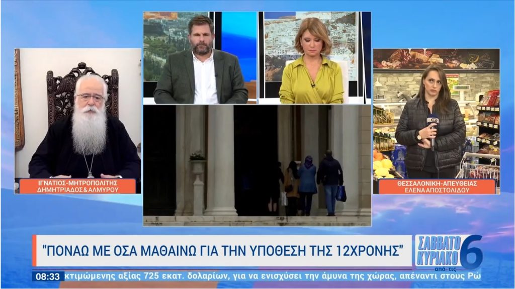 Στην ΕΤ1 και στην νέα ενημερωτική εκπομπή «Σαββατοκύριακο από τις 6», με τους δημοσιογράφους: Δημήτρη Κοτταρίδη και Νίνα Κασιμάτη, μίλησε σήμερα ο Σεβ. Μητροπολίτης Δημητριάδος κ. Ιγνάτιος.