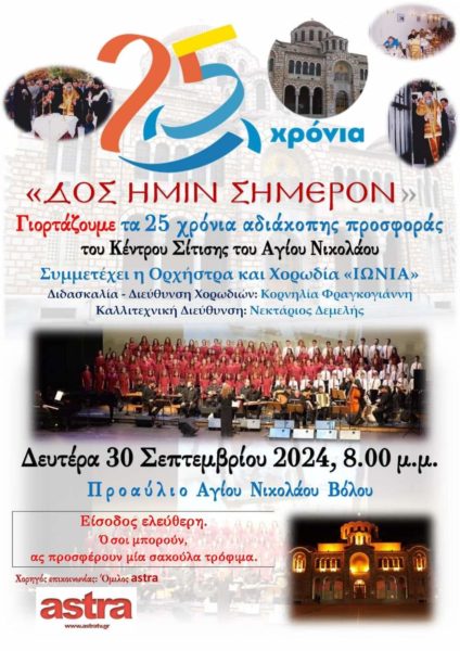 27/09/2024 28/09/2024 Είκοσι πέντε (25) χρόνια ιστορίας και αδιάκοπης λειτουργίας και προσφοράς συμπλήρωσε το Κέντρο Σίτισης του Μητροπολιτικού Ιερού Ναού Αγίου Νικολάου Βόλου «ΔΟΣ ΗΜΙΝ ΣΗΜΕΡΟΝ», το οποίο ιδρύθηκε το 1999 από τον Σεβασμιώτατο Μητροπολίτη Δημητριάδος κ. Ιγνάτιο. Όλα αυτά τα χρόνια το Κέντρο λειτουργεί καθημερινά και προσφέρει δωρεάν φαγητό στους εμπερίστατους συμπολίτες μας, χωρίς όρους και...