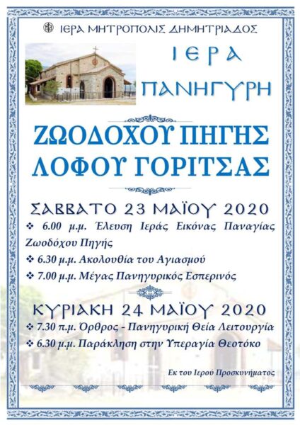 Η Ιερά Πανήγυρη της Ζωοδόχου Πηγής, η οποία κανονικά τελείται την Διακαινήσιμη Εβδομάδα, θα τελεστεί το Σάββατο και την Κυριακή 23 και 24 Μαΐου αντίστοιχα στο Λόφο της Παναγίας Γορίτσας. Η Πανήγυρις άλλαξε μέρα εορτασμού λόγω της πανδημίας του κορωνοϊού. Ειδικότερα το Σάββατο η Ιερά Εικόνα της Παναγίας Ζωοδόχου Πηγής που φυλάσσεται στον Ιερό Ναό Εισοδίων της Θεοτόκου Άνω Βόλου θα φτάσει στον Ιερό Ναό στις 18:00 ώρα και θα ακολουθήσει η Ακολουθία του Αγιασμού και ο Μέγας Πανηγυρικός Εσπερινός.