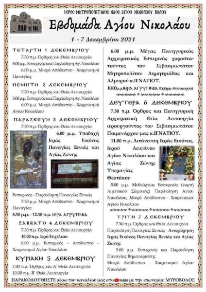 Εβδομάδα λατρευτικών εκδηλώσεων, από 1η έως 7 Δεκεμβρίου, διοργανώνει ο Ιερός Μητροπολιτικός Ναός του Βόλου ενόψει της πανηγύρεως του Προστάτου και Πολιούχου, Αγίου Νικολάου. Κατά τη διάρκεια των ημερών αυτών, καθημερινά θα τελούνται το πρωί ο Όρθρος και η Θεία Λειτουργία, ενώ στις 5 μ.μ. ο Εσπερινός και η Ιερά Παράκληση του Αγίου Νικολάου ή της Παναγίας αντιστοίχως. Θα ακολουθεί το Μικρό Απόδειπνο και οι Χαιρετισμοί του Αγίου Νικολάου ή της Παναγίας.