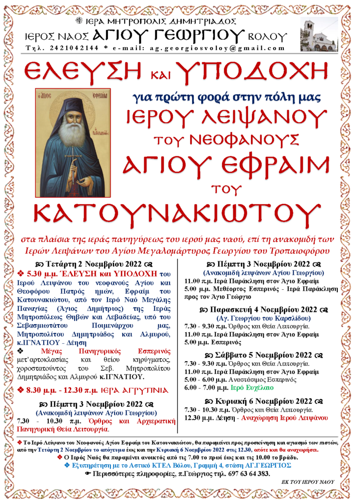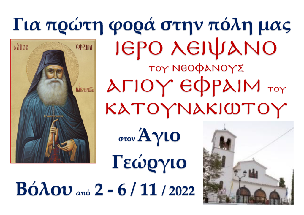 01/11/2022 01/11/2022 Το Ιερό Λείψανο του Οσίου Εφραίμ του Κατουνακιώτη θα υποδεχθεί αύριο, Τετάρτη 2 Νοεμβρίου 2022, ο Ιερός Ναός Αγίου Γεωργίου Βόλου. Η έλευση του ιερού λειψάνου, η οποία θα γίνει για πρώτη φορά στην πόλη, πραγματοποιείται από στο πλαίσιο του εορτασμού της ανακομιδής του ιερού λειψάνου του Αγίου Γεωργίου του Τροπαιοφόρου. Αναλυτικά το πρόγραμμα:  5.30...