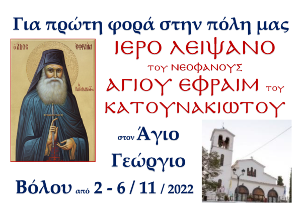 Το Ιερό Λείψανο του Οσίου Εφραίμ του Κατουνακιώτη θα υποδεχθεί αύριο, Τετάρτη 2 Νοεμβρίου 2022, ο Ιερός Ναός Αγίου Γεωργίου Βόλου. Η έλευση του ιερού λειψάνου, η οποία θα γίνει για πρώτη φορά στην πόλη, πραγματοποιείται από στο πλαίσιο του εορτασμού της ανακομιδής του ιερού λειψάνου του Αγίου Γεωργίου του Τροπαιοφόρου. Αναλυτικά το πρόγραμμα: 5.30 … Συνεχίστε να διαβάζετε το Για πρώτη φορά στην πόλη του Βόλου, ιερό λείψανο του Αγίου Εφραίμ του Κατουνακιώτου.