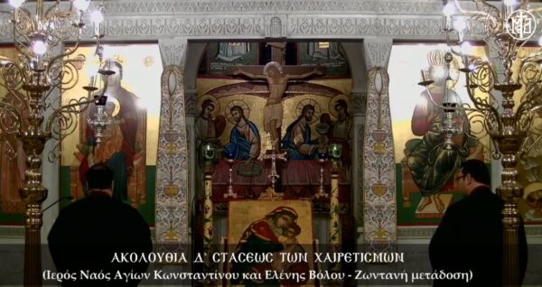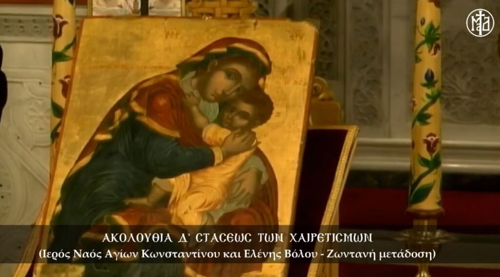 Ι.Ν. Αγίων Κωνσταντίνου και Ελένης Βόλου, την Δ’ Στάση των Χαιρετισμών προς την Υπεραγία Θεοτόκο υπό του Σεβασμιωτάτου Μητροπολίτου Δημητριάδος και Αλμυρού κ. Ιγνατίου.