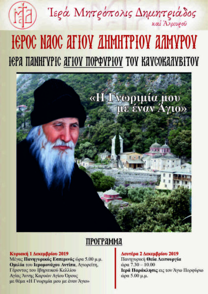 Η μνήμη του νεοφανούς Οσίου Πορφυρίου του Καυσοκαλυβίτου θα τιμηθεί στον Ιερό Ναό Αγίου Δημητρίου Αλμυρού, το διήμερο 1-2/12, κατά το ακόλουθο πρόγραμμα: