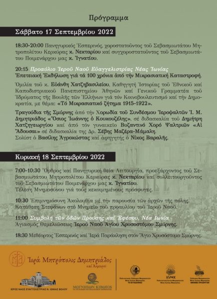 Κορυφώνονται οι εκδηλώσεις μνήμης για τα 100 χρόνια από την Μικρασιατική Καταστροφή του 1922 που διοργάνωσε η Ιερά Μητρόπολη Δημητριάδος. Η Νέα Ιωνία του Βόλου, με επίκεντρο το σύμβολό της, την Ευαγγελίστρια και του φορέα της στον Πολιτισμό, «Μαγνήτων Κιβωτός, για τη διάσωση του πολιτιστικού αποθέματος», οι Μικρασιατικοί Σύλλογοι της Νέας Ιωνίας, ο Πολιτιστικός Σύλλογος Μικρασιατών Ν. Ιωνίας Μαγνησίας «ΤΟ ΕΓΓΛΕΖΟΝΗΣΙ», η Πολιτιστική Εστία Μικρασιατών Νέας Ιωνίας Μαγνησίας «ΙΩΝΕΣ» και ο Σύλλογος Μικρασιατών Νέας Ιωνίας Μαγνησίας «Μνήμες Προσφύγων», συνδιοργανώνουν ένα ενιαίο συλλογικό πρόγραμμα που καλύπτει όλο το επετειακό έτος 2022 με εκδηλώσεις Μνήμης, θρησκευτικές, επιστημονικές, εκπαιδευτικές και πολιτιστικές.