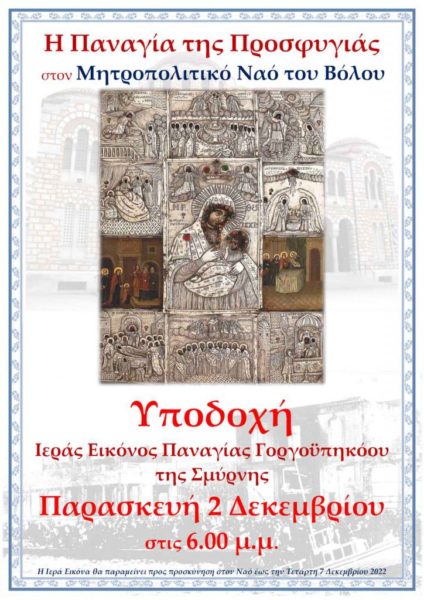 Ξεχωριστή τιμή και ευλογία συνιστά για την πόλη του Βόλου, αλλά και της Τοπικής Εκκλησίας η έλευση και ολιγοήμερη παραμονή στον Μητροπολιτικό Ιερό Ναό Αγίου Νικολάου της Ιεράς Εικόνος της Παναγίας Γοργοϋπηκόου της Σμύρνης. Η έλευση της Παναγίας της Σμύρνης εντάσσεται στο πρόγραμμα των λατρευτικών εκδηλώσεων που κατάρτισε ο Μητροπολιτικός Ναός, από 1 έως 7 Δεκεμβρίου, με σκοπό την καλύτερη δυνατή πνευματική προετοιμασία όλων για τον εορτασμό του Πολιούχου Αγίου Νικολάου.
