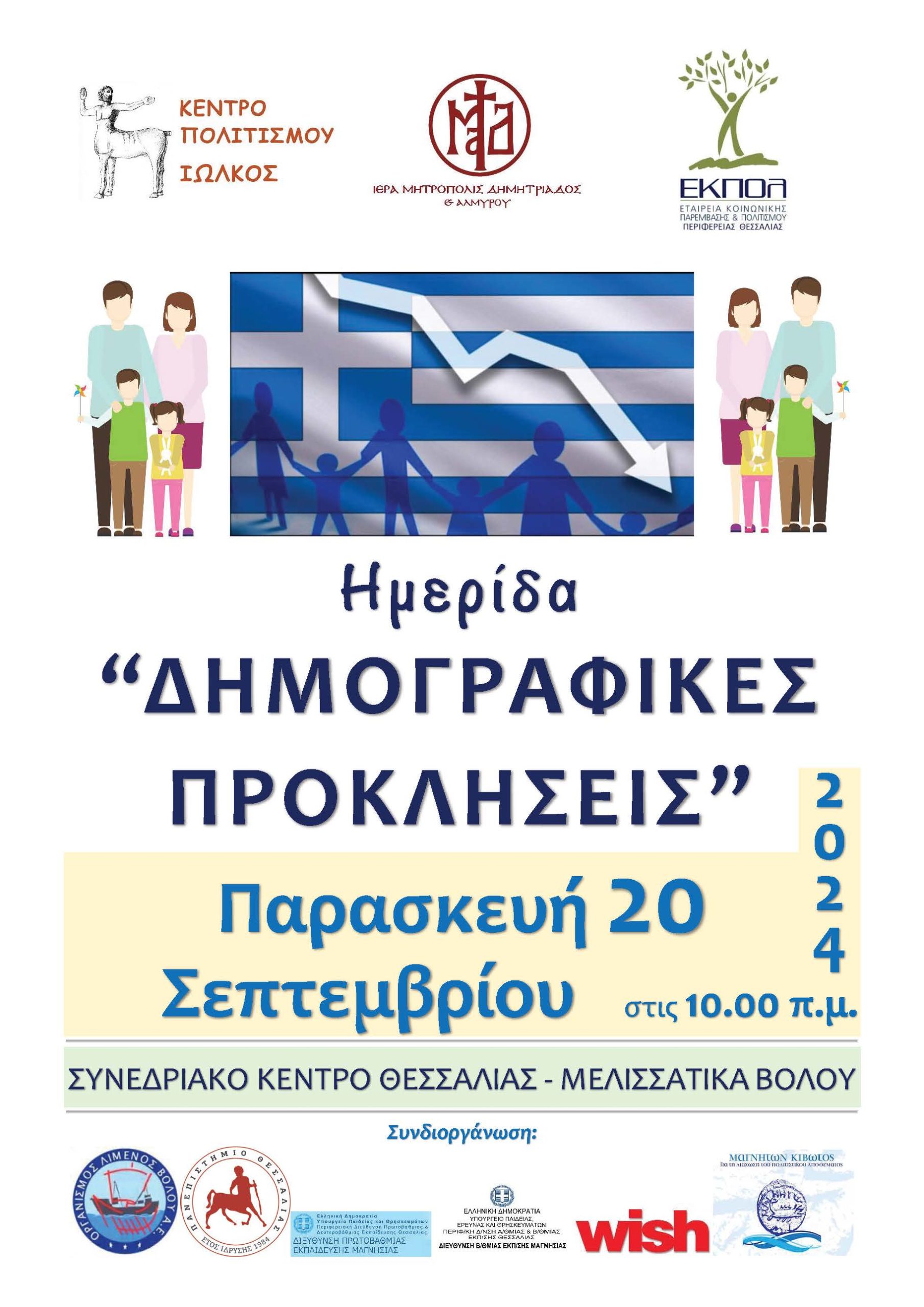 Το Κέντρο Πολιτισμού Ιωλκός σε συνεργασία με την Μητρόπολη Δημητριάδος, το Τμήμα Οικονομικών Επιστημών του Πανεπιστημίου Θεσσαλίας, την ΕΚΠΟΛ- Μαγνησίας, τον Πολιτιστικό Φορέας της Ιεράς Μητροπόλεως “Μαγνήτων Κιβωτός”, για την διάσωση του πολιτιστικού αποθέματος, τις Διευθύνσεις Πρωτ/θμιας και Δευτ/θμιας Εκπαίδευσης και το περιοδικό Wish, διοργανώνουν ημερίδα με θέμα «Δημογραφικές προκλήσεις».