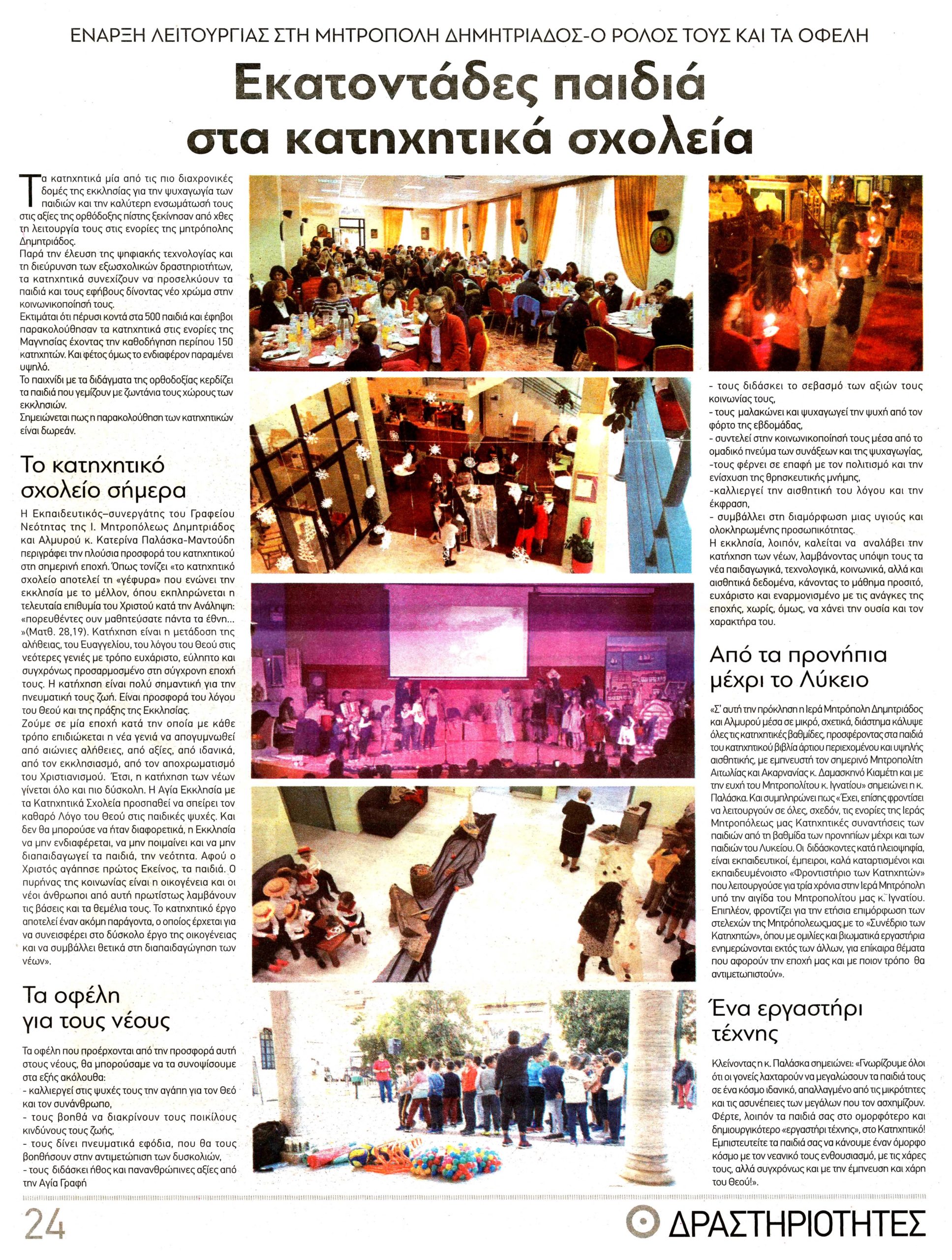 «Σ’ αυτή την πρόκληση η Ιερά Μητρόπολη Δημητριάδος και Αλμυρού μέσα σε μικρό, σχετικά, διάστημα κάλυψε όλες τις κατηχητικές βαθμίδες, προσφέροντας στα παιδιά του κατηχητικού, βιβλία άρτιου περιεχομένου και υψηλής αισθητικής, με εμπνευστή τον σημερινό Μητροπολίτη Αιτωλίας και Ακαρνανίας κ. Δαμασκηνό Κιαμέτη και με την ευχή του Μητροπολίτου κ. Ιγνατίου» σημειώνει η κ. Παλάσκα. Και συμπληρώνει πως «Έχει, επίσης φροντίσει να λειτουργούν σε όλες, σχεδόν, τις ενορίες της Ιεράς Μητροπόλεως μας Κατηχητικές συναντήσεις των παιδιών από τη βαθμίδα των προνηπίων μέχρι και των παιδιών του Λυκείου. Οι διδάσκοντες κατά πλειοψηφία, είναι εκπαιδευτικοί, έμπειροι, καλά καταρτισμένοι και εκπαιδευμένοι στο «Φροντιστήριο των Κατηχητών» που λειτουργούσε για τρία χρόνια στην Ιερά Μητρόπολη υπό την αιγίδα του Μητροπολίτου μας κ.Iγνατίου. Επιπλέον, φροντίζει για την ετήσια επιμόρφωση των στελεχών της Μητρόπολεώς μας με το «Συνέδριο των Κατηχητών», όπου με ομιλίες και βιωματικά εργαστήρια ενημερώνονται εκτός των άλλων, για επίκαιρα θέματα που αφορούν την εποχή μας και με ποιον τρόπο θα αντιμετωπιστούν».