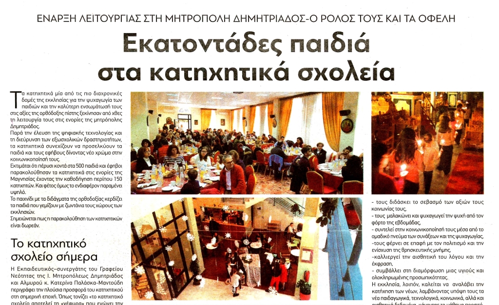Η Εκπαιδευτικός-συνεργάτης του Γραφείου Νεότητας της I. Μητροπόλεως Δημητριάδος και Αλμυρού κ. Κατερίνα Παλάσκα-Μαντούδη περιγράφει την πλούσια προσφορά του κατηχητικού στη σημερινή εποχή. Όπως τονίζει «το κατηχητικό σχολείο αποτελεί τη «γέφυρα» που ενώνει την εκκλησία με το μέλλον, όπου εκπληρώνεται η τελευταία επιθυμία του Χριστού κατά την Ανάληψη·, «πορευθέντες ουν μαθητεύσατε πάντα τα έθνη… »(Ματθ. 28,19). Κατήχηση είναι η μετάδοση της αλήθειας, του Ευαγγελίου, του λόγου του θεού στις νεότερες γενιές με τρόπο ευχάριστο, εύληπτο και συγχρόνως προσαρμοσμένο στη σύγχρονη εποχή τους. Η κατήχηση είναι πολύ σημαντική για την πνευματική τους ζωή. Είναι προσφορά του λόγου του θεού και της πράξης της Εκκλησίας.