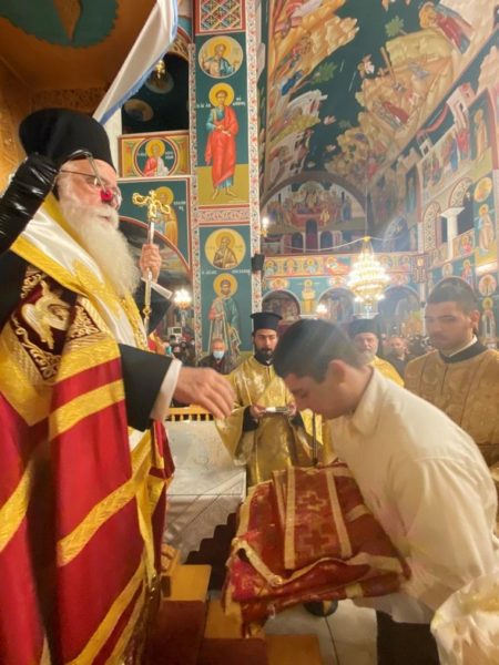 Κατά την διάρκεια το Εσπερινού, ο Σεβασμιώτατος προεχείρησε σε Αναγνώστη τον κ. Ευστάθιο Γλάρο, μαθητή της 2ας Εσπερινού Λυκείου, ο οποίος κατά τις πρωινές ώρες της ημέρας εργάζεται, προκειμένου να βοηθήσει οικονομικώς την οικογένειά του, γεγονός που ο Ποιμενάρχης μας ιδιαιτέρως εκτίμησε και επαίνεσε, ενώ ασχολείται και με το άθλημα της Πάλης.