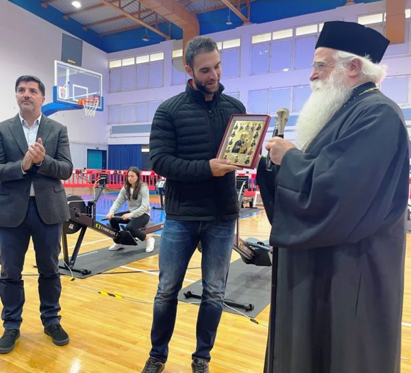 Ο Σεβασμιώτατος απένειμε τιμητική διάκριση στον χρυσό Ολυμπιονίκη της κωπηλασίας, Στέφανο Ντούσκο, τιμώντας τη μεγάλη του προσφορά στον ελληνικό αθλητισμό.