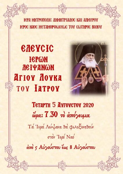 Πανηγυρίζει μεγαλοπρεπώς την μεγάλη Δεσποτική εορτή της Μεταμορφώσεως του Κυρίου, ο ομώνυμος Ιερός Ναός του Βόλου, το διήμερο 5-6/8. Στο πλαίσιο του εορτασμού, θα αφιχθούν Ιερά Λείψανα του Αγίου Λουκά, Αρχιεπισκόπου Συμφερουπόλεως & Κριμαίας, του Ιατρού, που φυλάσσονται στην Ιερά Μητρόπολη Αργολίδος.