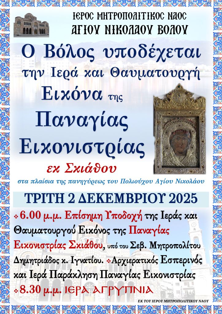 Η Ιερά Εικόνα θα αφιχθεί στον Μητροπολιτικό Ναό του Βόλου την Τρίτη 2 Δεκεμβρίου 2025, στις 6μ.μ., στο πλαίσιο της ιεράς πανηγύρεως του Πολιούχου του Βόλου Αγίου Νικολάου. Την Παναγία Εικονίστρια θα υποδεχθεί επισήμως ο Σεβ. Μητροπολίτης Δημητριάδος κ. Ιγνάτιος, επικεφαλής του ιερού Κλήρου και του ευσεβούς λαού.