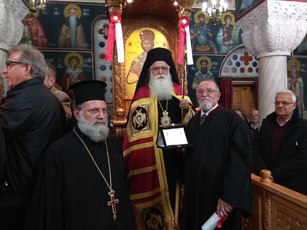 Στο τέλος του Εσπερινού, ο Σεβ. Ποιμενάρχης απένειμε, εκ μέρους του Εκκλ/κού Συμβουλίου, Τιμητική Πλακέτα στον επί σειρά ετών Λαμπαδάριο του Ναού κ. Δημήτριο Μανώλη. Εξήρε το ήθος του τιμηθέντος Ιεροψάλτου, την αγάπη του για την Ψαλτική τέχνη και το πνεύμα συνεργασίας που διαχρονικά τον διακρίνει. Μίλησε για διδακτικό έργο, που επί χρόνια προσφέρει στο Παράρτημα της Σχολής Βυζαντινής Μουσικής στον Αλμυρό, με διάθεση ιεραποστολική, φροντίζοντας για την ανανέωση του ιεροψαλτικού δυναμικού της περιοχής.