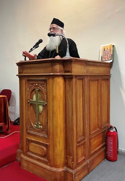 Στον σύντομο χαιρετισμό του ο Σεβασμιώτατος εξήρε το έργο του π. Αμφιλοχίου, χαρακτηρίζοντάς τον «πολύτιμο στον πυρήνα του διαλόγου της Ορθοδοξίας». Ο Σεβ. Ποιμενάρχης μας υπογράμμισε δε την ανάγκη για ενότητα και συνέχιση της Πατερικής Παράδοσης, σημειώνοντας πως «το Άγιο Πνεύμα συνεχίζει να λειτουργεί στην Εκκλησία και σήμερα». Συνεχίζοντας, έκανε ειδική αναφορά στην αξία της ενότητας της Εκκλησίας, τόσο σε τοπικό όσο και σε παγκόσμιο επίπεδο, και κάλεσε τους παρευρισκόμενους να προσευχηθούν για την αντιμετώπιση των προκλήσεων της εποχής μας. Όπως τόνισε χαρακτηριστικά, «η ταυτότητά μας είναι συνυφασμένη με την Ορθοδοξία, που αποτελεί το ζωντανό συνδετικό μας κρίκο». Τέλος, προέτρεψε τους παρισταμένους να στηρίξουν την ελληνική οικογένεια, ευχόμενος οι Τρεις Ιεράρχες να εμπνέουν πάντοτε με το πνεύμα τους όλους όσοι υπηρετούν την Παιδεία και την Εκκλησία.