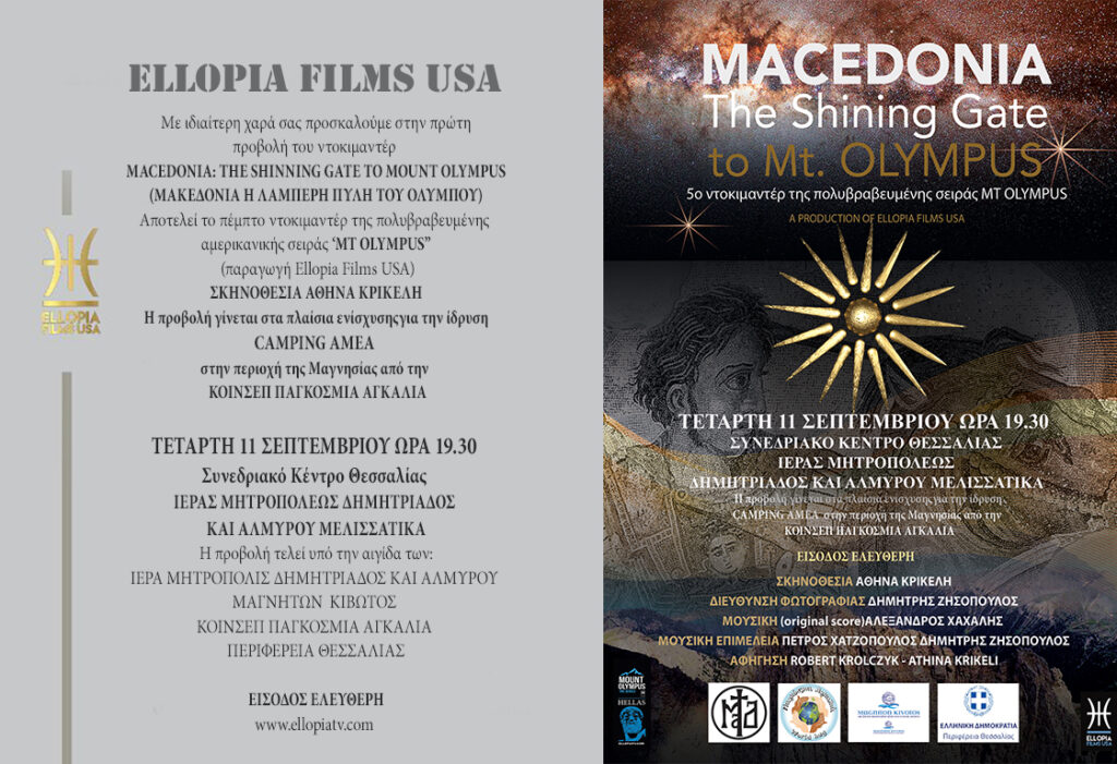 Τετάρτη 11 Σεπτεμβρίου 2019 ώρα 19.30 στο Συνεδριακό Κέντρο Θεσσαλίας στα Μελισσάτικα, ο φορέας Πολιτισμού της Ιεράς Μητροπόλεως Δημητριάδος και Αλμυρού, «Μαγνήτων Κιβωτός, για τη διάσωση του Πολιτιστικού Αποθέματος», σε συνεργασία με την Κοινωνική Συνεταιριστική Επιχείρηση Συλλογικής & Κοινωνικής Ωφέλειας «ΠΑΓΚΟΣΜΙΑ ΑΓΚΑΛΙΑ», διοργανώνουν την προβολή, με ελεύθερη είσοδο για το κοινό, του 5ου ντοκιμαντέρ της πολυβραβευμένης αμερικανικής σειράς «Mount Olympus» με τίτλο: ΜΑΚΕΔΟΝΙΑ Η ΛΑΜΠΕΡΗ ΠΥΛΗ ΤΟΥ ΟΛΥΜΠΟΥ και στα αγγλικά: