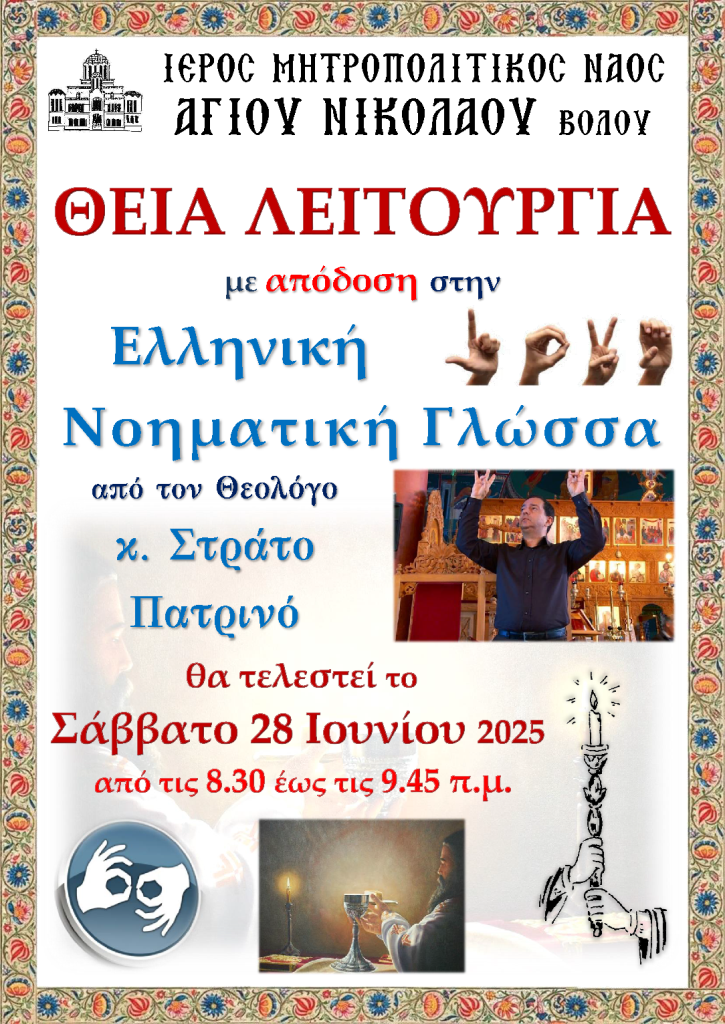 Η πρώτη Θεία Λειτουργία, με ταυτόχρονη διερμηνεία στην νοηματική γλώσσα, θα τελεστεί το Σάββατο 28 Ιουνίου, στον Μητροπολιτικό Ιερό Ναό Αγίου Νικολάου Βόλου, από τις 8.30 έως τις 9.45π.μ. Η διερμηνεία θα γίνει από τον κ. Στράτο Πατρινό, Θεολόγο και εκπαιδευτικό στη δημόσια εκπαίδευση, αποσπασμένο στην Ιερά Αρχιεπισκοπή Αθηνών για την κάλυψη των λατρευτικών αναγκών των κωφών και των βαρήκοων, πιστοποιημένο διερμηνέα Νοηματικής επί 30 έτη.