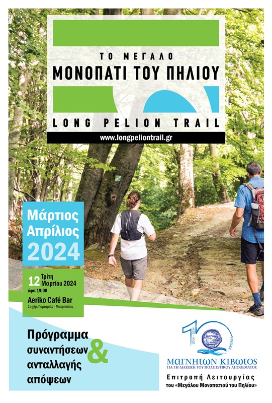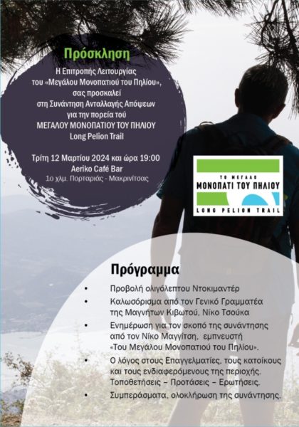 Το πρόγραμμα ξεκινάει με την Συνάντηση Ενημέρωσης και Ανταλλαγής απόψεων για το «ΜΕΓΑΛΟ ΜΟΝΟΠΑΤΙ ΤΟΥ ΠΗΛΙΟΥ», σήμερα Τρίτη 12 Μαρτίου 2024, ώρα 19.30 Aeriko Café Bar (1ο χλμ. Πορταριάς – Μακρινίτσας).
