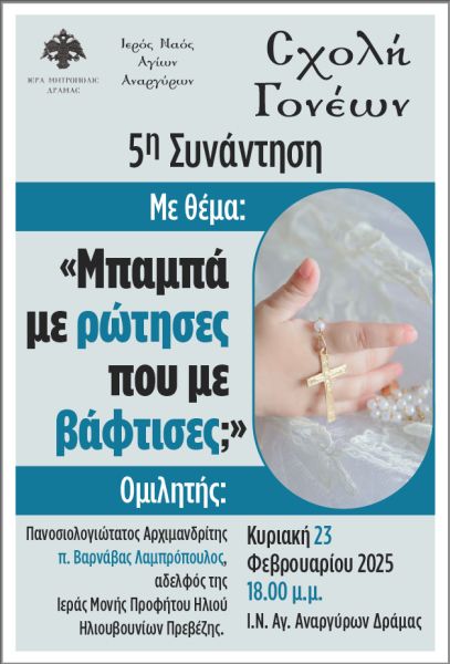Στο πλαίσιο λειτουργίας, για τέταρτη χρονιά, της «ΣΧΟΛΗΣ ΓΟΝΕΩΝ» της Ι.Μ. Δράμας, προσκεκλημένος ομιλητής της 5ης (πέμπτης ) συνάντησης για το τρέχον εκκλησιαστικό έτος, που θα πραγματοποιηθεί τη Κυριακή 23 Φεβρουαρίου 2025 στις 18.00 μ.μ. στον Ι.Ν. Αγ. Αναργύρων Δράμας, είναι ο Πανοσιολογιώτατος Αρχιμανδρίτης π. Βαρνάβας Λαμπρόπουλος, αδελφός της Ιεράς Μονής Προφήτου Ηλιού Ηλιουβουνίων Πρεβέζης.
