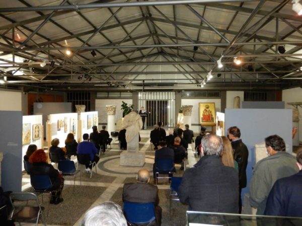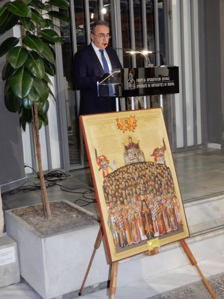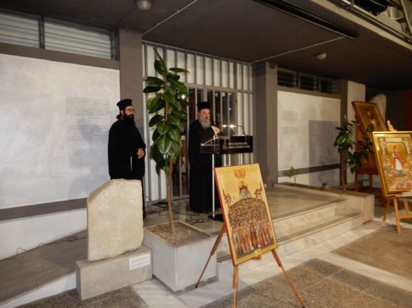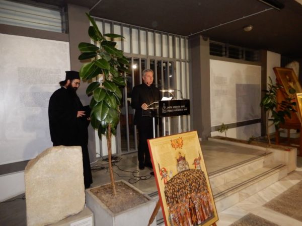 Κατά τη διάρκεια της εκδήλωσης των εγκαινίων χαιρετισμό απεύθυναν ο Σεβασμιώτατος Μητροπολίτης Δράμας κ. Παύλος, η Προϊσταμένη της Εφορείας Αρχαιοτήτων Δράμας κυρία Βασιλική Πουλιούδη και ο Διευθυντής της Αγιορειτικής Εστίας Θεσσαλονίκης κ. Αναστάσιος Ντούρος, ενώ ακολούθησαν ομιλίες από τον κ. Συμεών Πασχαλίδη, Καθηγητή της Θεολογικής Σχολής του ΑΠΘ και Διευθυντή του Πατριαρχικού Ιδρύματος Πατερικών Μελετών, με θέμα: «Νεομάρτυρες: προάγγελοι της Ελευθερίας, ομολογητές της Πίστης» και από τον Γέροντα Νικόδημο Αγιοπαυλίτη, με θέμα: «Οι νεομάρτυρες της Ιεράς Μονής Εικοσιφοινίσσης».