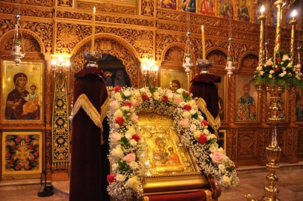 Πριν την απόλυση εψάλησαν τα εγκώμια του Οσίου Γεωργίου και ακολούθησε εντός του Ιερού Ναού λιτανεία του ιερού λειψάνου του.