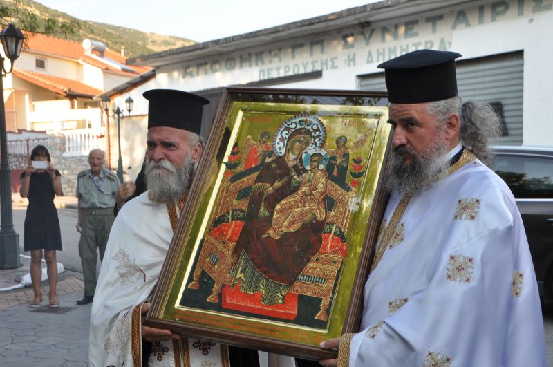 Πραγματοποιήθηκε το Σάββατο 22 Αυγούστου 2020 στις 7 το απόγευμα, στην Πετρούσα της Δράμας η τελετή υποδοχής πιστού αντιγράφου της θαυματουργού Ιεράς Εικόνας της Παναγίας Παντανάσσης, το πρωτότυπο της οποίας φυλάσσεται στην Ιερά Μονή Βατοπαιδίου Αγίου Όρους.